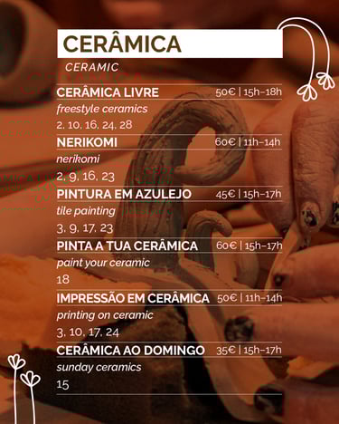 Descobre a fusão perfeita entre cerâmica, desenho e impressão neste workshop criativo! Aprende a projetar e criar as tuas próprias peças de cerâmica incorporando técnicas de desenho e impressão diretamente no barro. Este workshop é ideal para quem quer relaxar, experimentar algo novo e dar asas à criatividade.