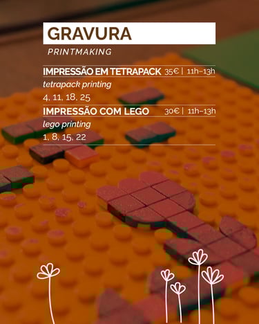 Participa numa experiência prática e criativa, onde explorarás a arte da impressão utilizando uma máquina de massa e embalagens recicladas de tetrapack. Neste workshop, aprenderás a transformar estes materiais do dia a dia em gravuras únicas, utilizando tinta e técnicas de gravura. Perfeito para todos os níveis, esta oficina é uma excelente oportunidade para soltar a criatividade, aprender práticas sustentáveis e conectar-te com outros amantes da arte.
