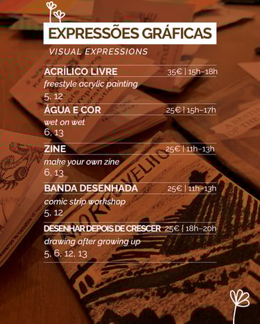 Explora o universo das zines e cria a tua própria publicação usando colagem, escrita, desenho ou o que quiseres. Nesta oficina livre e individual, vais construir uma zine única, com total liberdade de expressão visual. A partir de uma folha A4, vais dobrar, montar e dar forma às tuas ideias. Não é preciso ter experiência. Basta curiosidade e vontade de criar. Durante a sessão, terás também snacks e bebidas para tornar a experiência ainda mais leve e inspiradora.